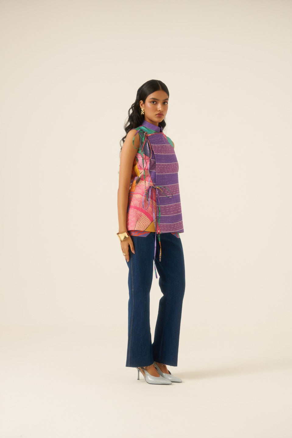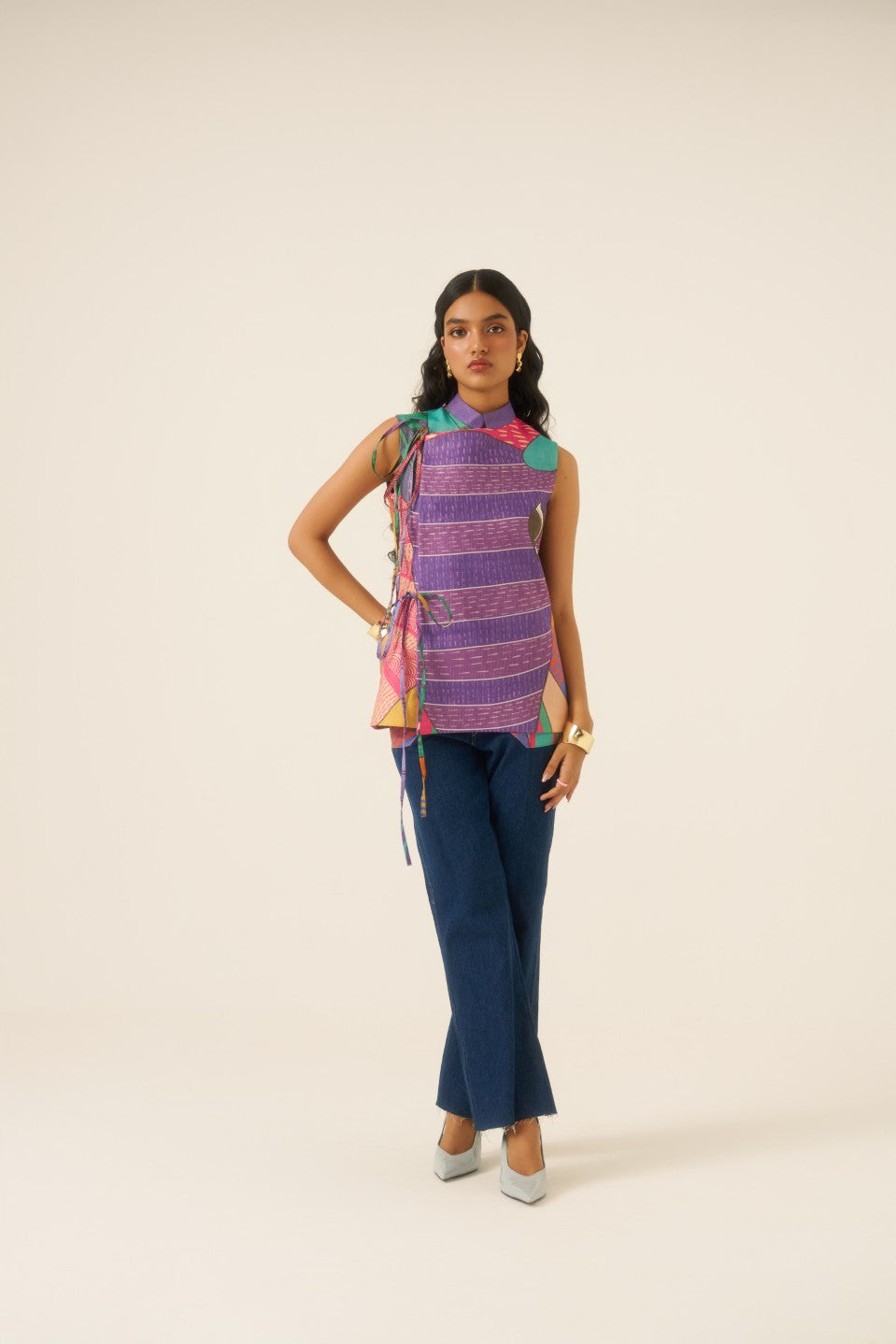Our Jungle Beat vest has a mock high neck with collar and side tie up detailing. The vest is crafted in our Jungle Beat Print.