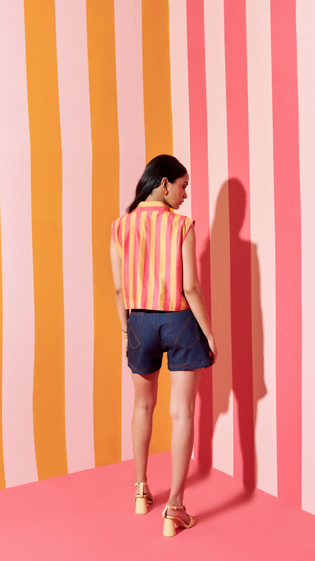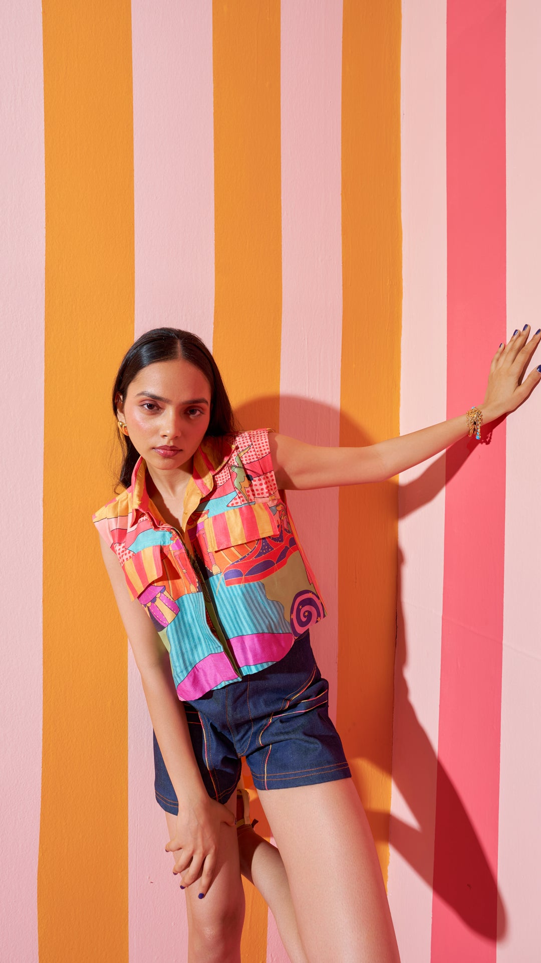 This set comprises of a sleevless shacket in out carnival print and contrasting stripe print collar and back. Paired with High Rise denim shorts. Front zip and metallic button fastening.