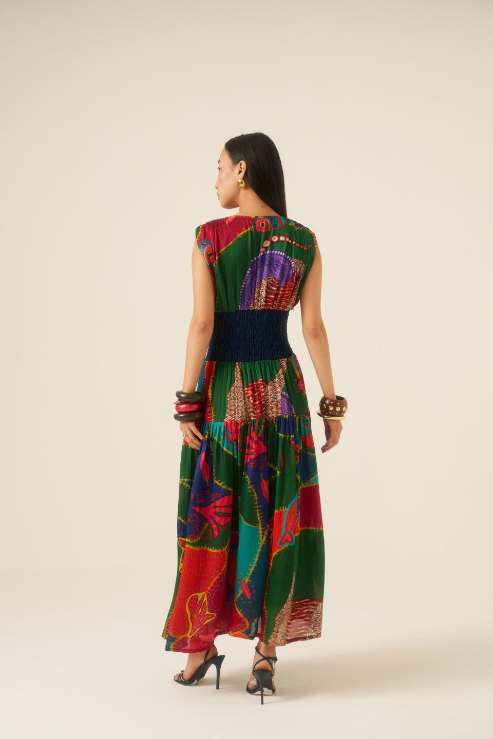 Our Forest Mosaic Dress is a celebration of color and craftsmanship. Designed with a sleeveless silhouette, it features a gathered bodice with a round neckline and subtle front slit around the neck for ease. The waistline is accentuated with wide elasticated smocking, creating a flattering, cinched shape that flows into a tiered, flared skirt. The Dress comes with a side zip closure.