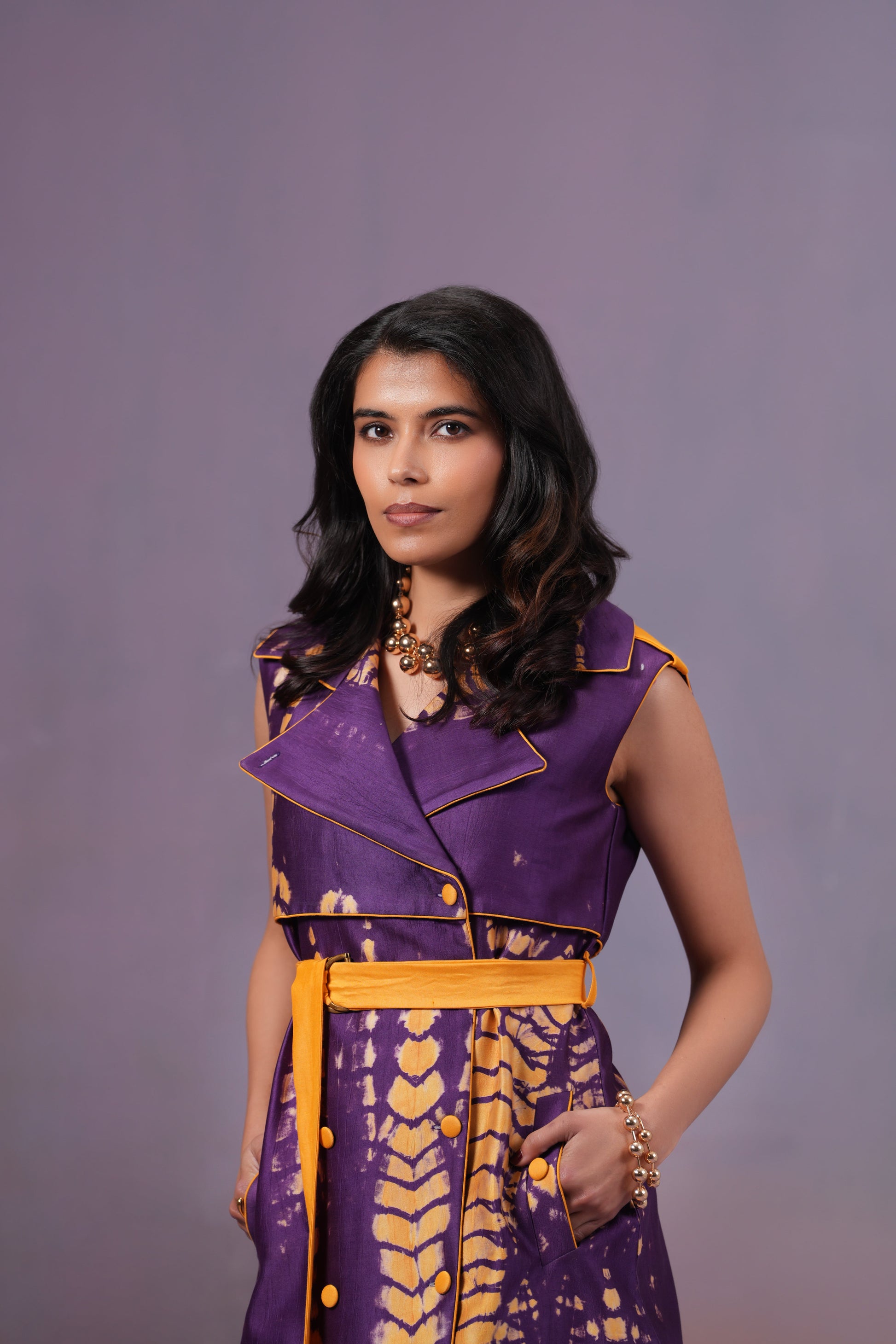 Hand-Dyed Shibori Trench Dress. Piping detailing on front and back. Contrasting fabric belt around the waist.