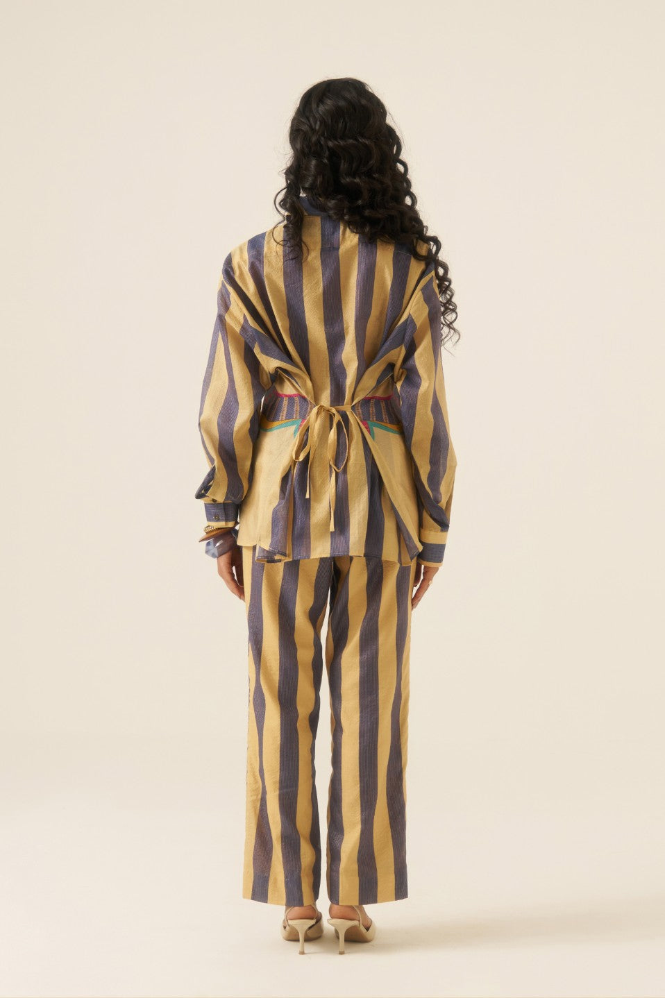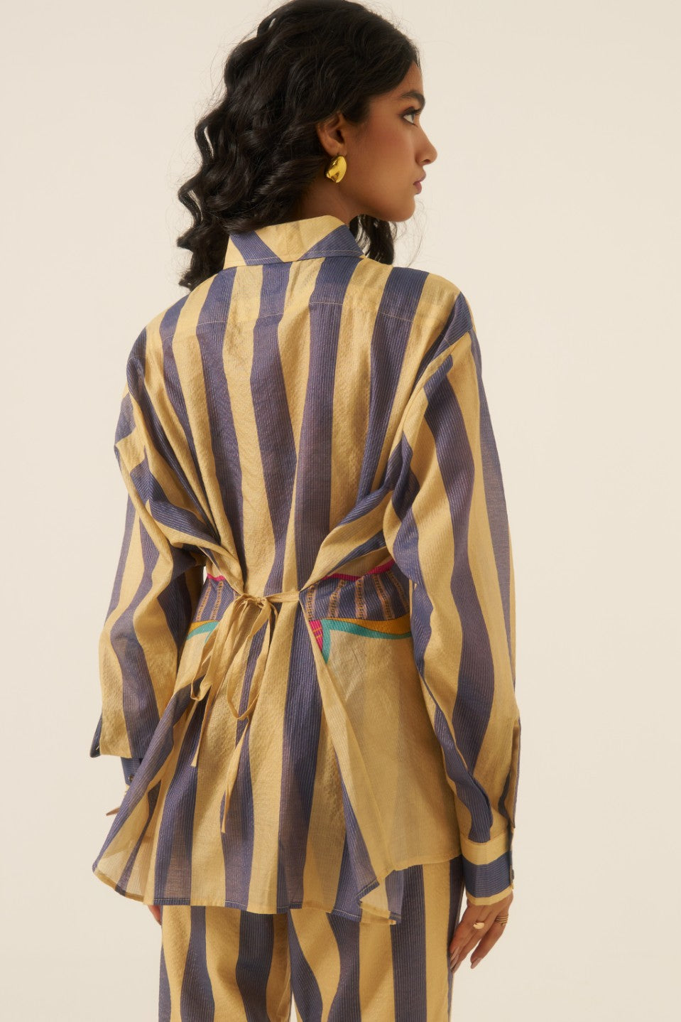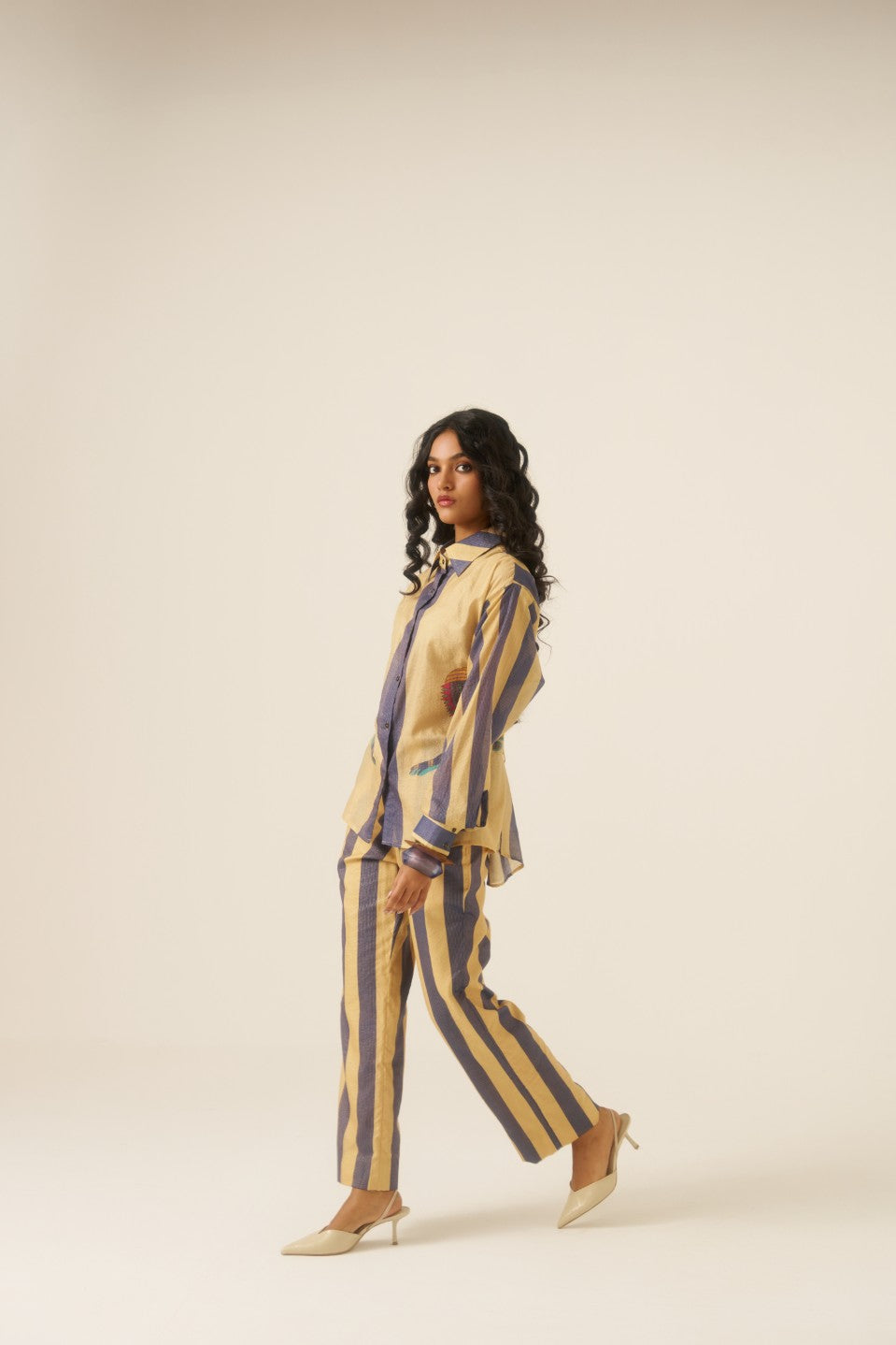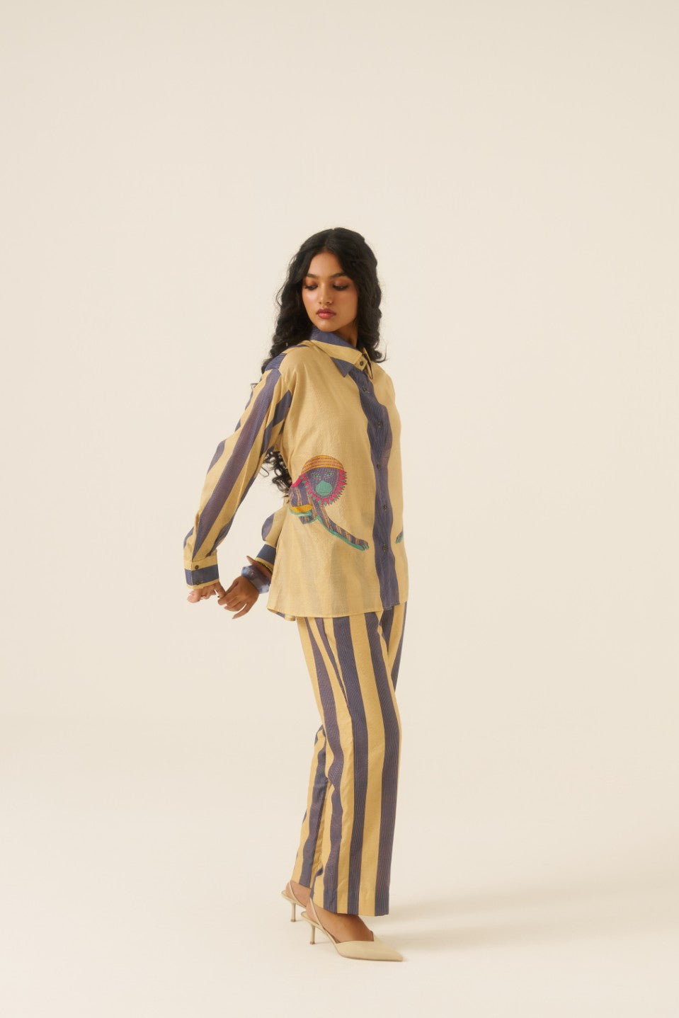 A relaxed-fit, free-size button-down shirt crafted in our Jungle Swing Print. The shirt features a solid slate-blue placket and collar, highlighted with Gond-inspired art motifs at the waist, adding a playful yet refined detail. Long sleeves with buttoned cuffs complete the structured yet easy silhouette.
