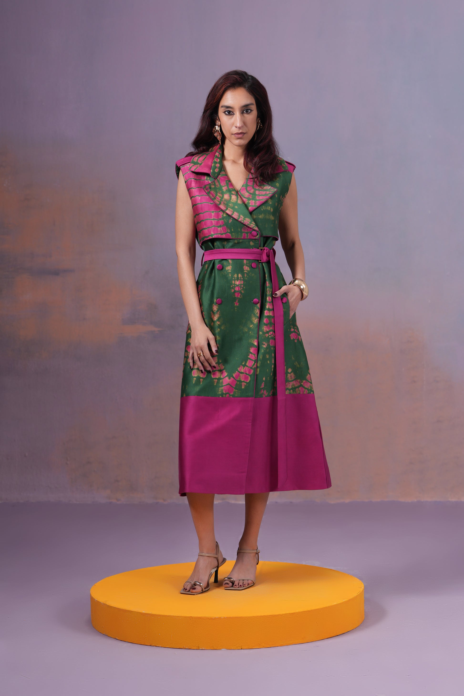 Hand-Dyed Shibori Trench Dress. Piping detailing on front and back. Contrasting fabric belt around the waist.